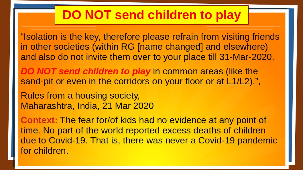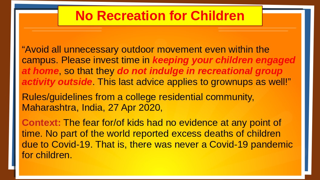In response to an appeal to reopen schools in early July 2021, the Kerala government responded in mid October 2021, implying in effect that schools can be reopened only after children have been "vaccinated" with the emergency-use product, although there was never a Covid-19 medical emergency for children anywhere in the world.